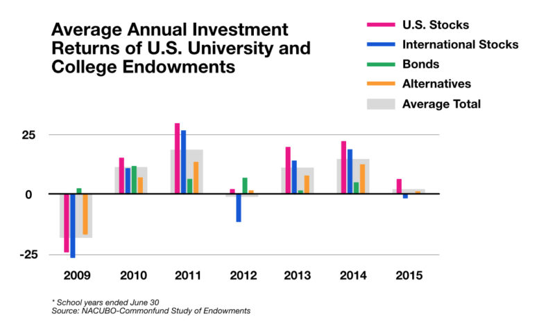 According to the National Association of College and University Business Officers and Commonfund, alternative investment returns have lagged behind U.S. stocks — badly — in each of the past six college years. The last time alternatives outperformed U.S. stocks in college was in the bear market of 2008-09. U.S. stocks lost 25.5 percent of their value that year. Alternatives lost 17.8 percent.