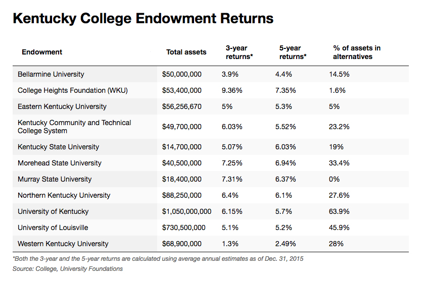 The endowment that generated the best three- and five-year returns as of Dec. 31 was the College Heights Foundation at Western Kentucky University. The smaller of two endowments at Western, College Heights posted an average annual return of 7.4 percent on its investments from 2011 through 2015. It was also the second-best performer in 2015 alone, when a flat stock market, low bond yields and plunging commodity prices sent most endowment balances into reverse.