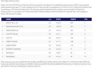 Gary Barber’s War of Will has a new bragging right to go along with his classic victory in the Preakness Stakes as the son of War Front earned 16 first-place votes and a total of 322 points to take over the lead position in this week’s National Thoroughbred Racing Association (NTRA) Top 3-Year-Old Poll.