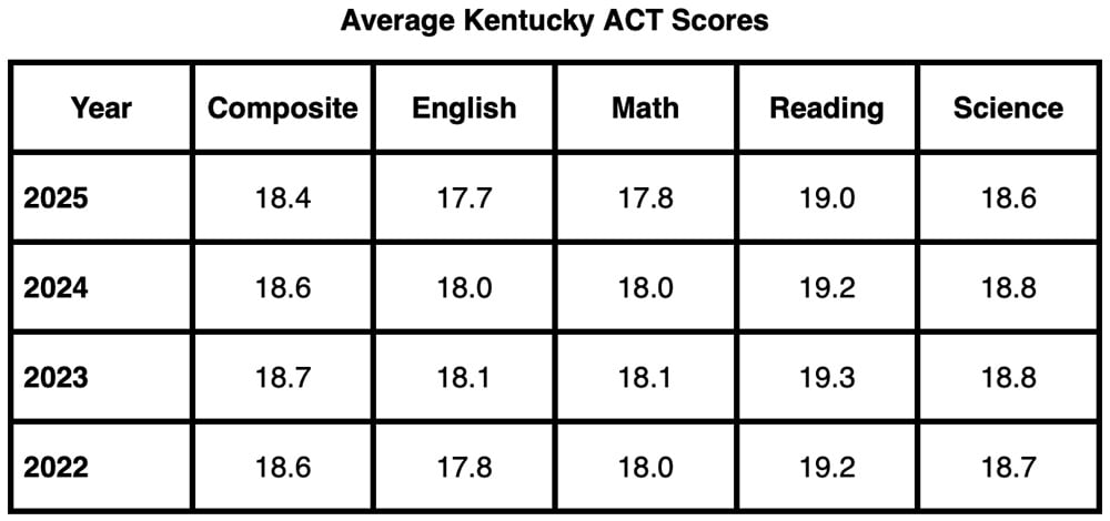 Kentucky students in the graduating class of 2025 earned an average composite score of 18.4 on the ACT. The most recent set of test information is used for students testing more than once. A total of 77 students earned a perfect score of 36.
