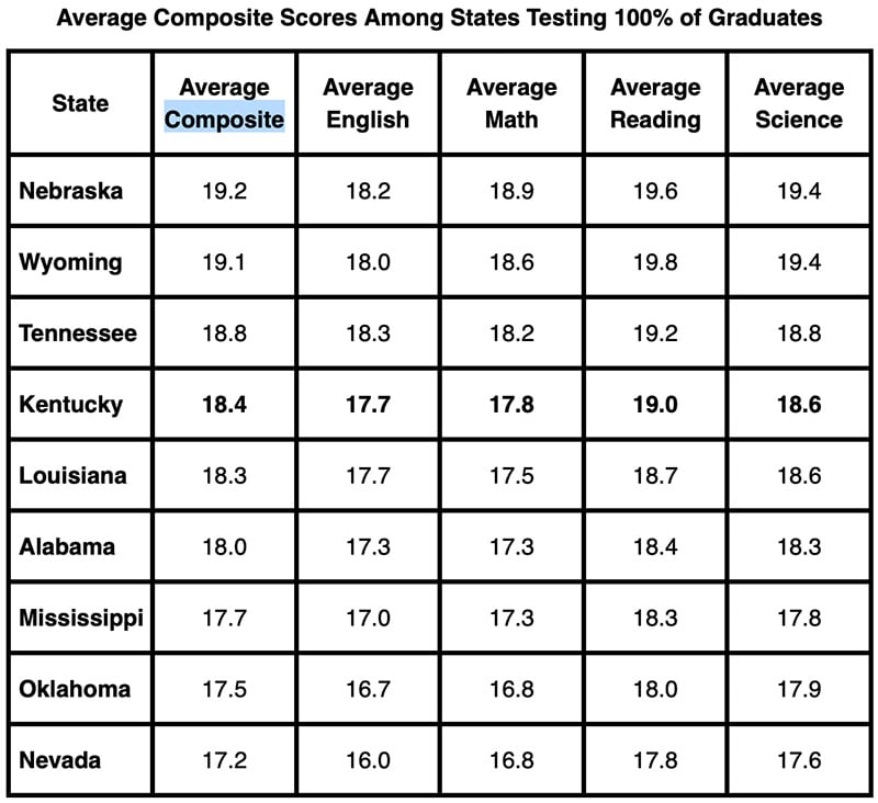 Kentucky’s average composite score ranks fourth among states testing 100% of their graduates, behind Nebraska, Wyoming and Tennessee.