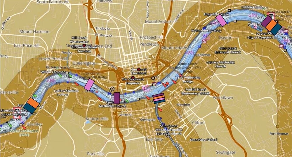 Throughout the event, large passenger vessels will be moored at and operating from Cincinnati Public Landing and Serpentine Wall. To aid in the safe transit of small watercraft and recreational vessels, additional red navigational aids will be placed from mile marker 469.5, Daniel Carter Beard Bridge, to mile marker 471.0, Clay Wade Bailey Bridge, on the Ohio River. If utilized by small watercraft and recreational vessels, these aids favor transit on the Kentucky (south) side of the buoys (left descending bank).