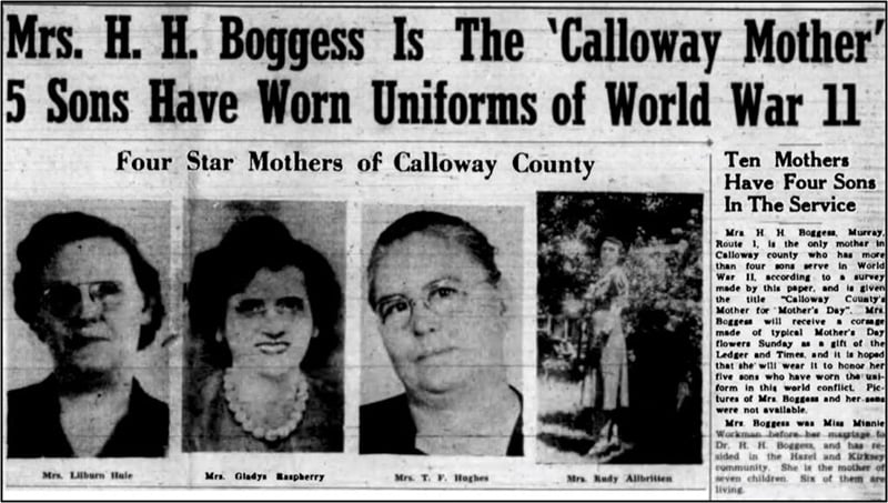 Coleman provided some additional details about those three examples and also mentioned local families who sent multiple sons to the war, such as Mrs. H.H. Boggess. The historian also reported that many soldiers from Calloway County were in the National Guard’s 149th Regiment.