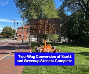 The two-way conversion of Greenup Street was completed on Thursday, October 9, followed by the Scott Street conversion on Friday, October 17.