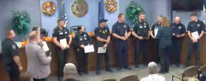 Several firefighters and police officers were given the life-saving award Monday night for their actions in responding to an accident on July 25 of this year. Dispatcher Lena Hargett, Officer Nathan Beikman, Officer Whitney Buerger, Officer Hunter Ransdell, Sergeant Joshua Salyers, and Firefighter/paramedic Mason O’Brien, Captain Kenny Harney, Captain Brian Strole, Firefighter/EMT Bryson Reiskamp, and firefighter/EMT Doug Stewart were all recognized for their efforts on that day. They were all given challenge coins in addition to the certificate and were greeted with a round of applause. Nathan Beikman also received the Lifesaver pin for arriving first and starting CPR until Paramedics could arrive.