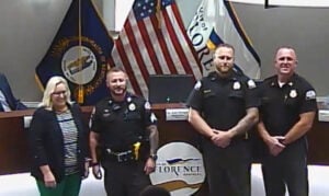 Florence Mayor Julie Aubuchon administered the oath of office to Mike Geis, who will be a Police Captain, and Erik Daniels, who will be a Police Lieutenant while their families looked on. The promotions were done in advance of Captain Greg Rehkamp’s retirement which will be at the end of the month. Chief Jeff Mallery led the audience in a round of applause for Rehkamp’s three decades of service.