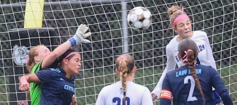 Highlands goalkeeper Bailee Class, far left, tries to block a corner kick that Central Hardin striker Carly Lang headed into the net during their state semifinal match. (Photo by Allen Ramsey)