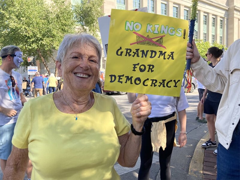 Dennis Van Horn, a Frankfort resident and veteran, said he came to the “No Kings” rally at the Kentucky Capitol because of the anxiety he feels from the Trump administration’s actions. (Kentucky Lantern photo by McKenna Horsley)