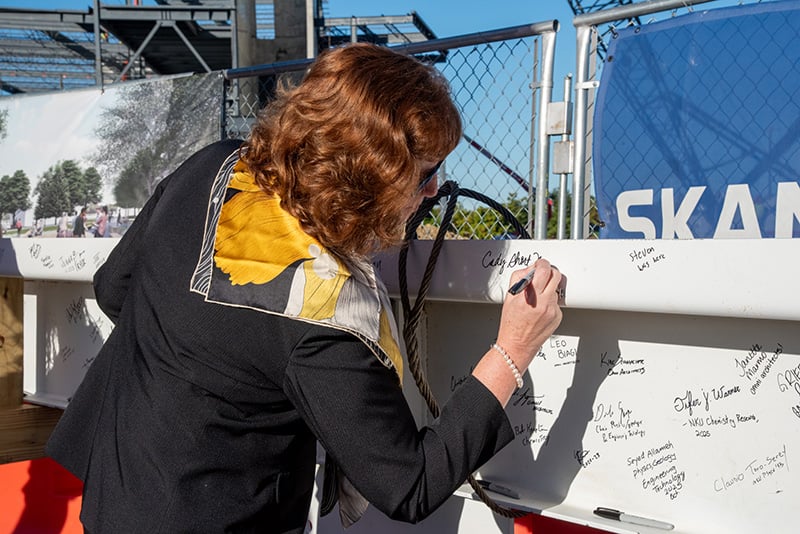 NKU President Dr. Cady Short-Thompson signs final steel beam for the Dorothy Westerman Herrmann Science Center during Thursday’s ceremony (Photo from NKU)