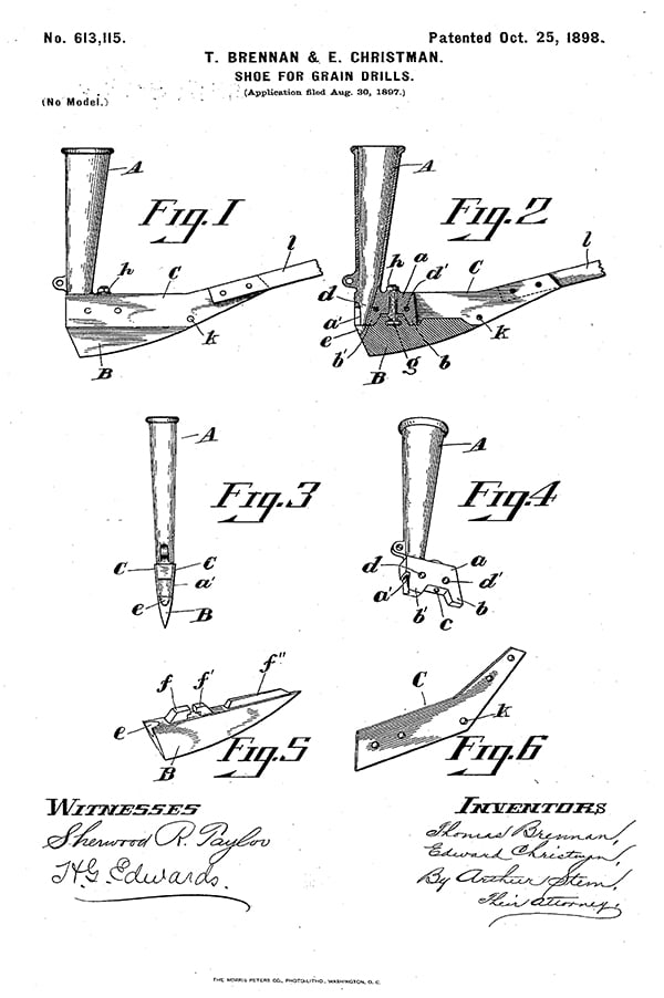 • US Patent No. 613,115 (1898) – A Shoe for Grain-Drills, co-developed with Edward Christman, improved the efficiency and precision of crop planting.