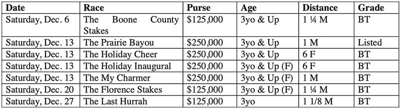Like last year, the Synthetic Championships will include the $250,000 Holiday Cheer, the $250,000 Holiday Inaugural presented by Claiborne Farm, the $250,000 My Charmer presented by Claiborne Farm and the $250,000 Prairie Bayou (Listed).