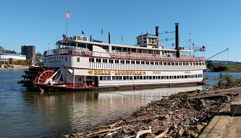 Like all things in life, the River Roots festival finally concluded last Sunday. Most of the boats waited until the next morning to rest the crews and get ready for the long trips home. On a bright sunny Monday morning, the “Crescent City Comet” blew a last salute at the cobblestone landing, backed around, and headed south. The BELLE OF LOUISVILLE paddled across the river to Covington, where she tied up at the old MIKE FINK steamboat-style restaurant parking lot to refuel before setting off upstream for a shipyard visit for her five-year U. S. Coast Guard inspection and recertification. The other boats drifted away shortly after, and by noon, the once bustling Public Landing was quiet again.