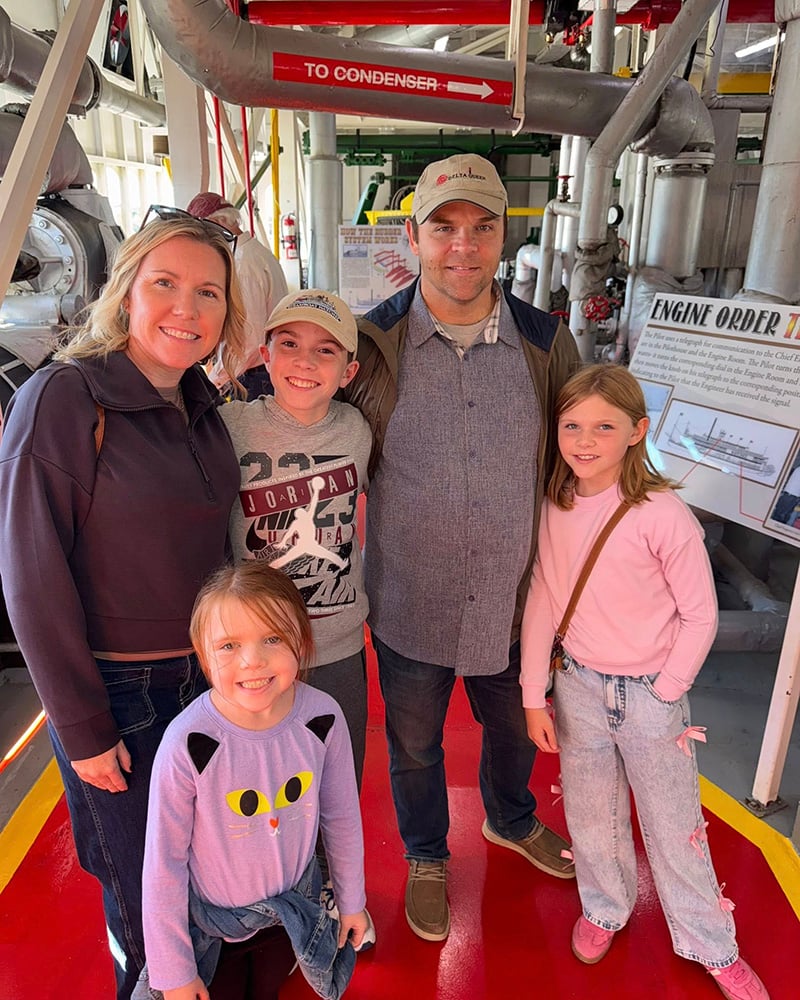 Quite surprisingly, Phillip Johnson, Chief Administrator of the DELTA QUEEN, brought the three-chimed Lunkenheimer whistle from the QUEEN and attached it to the steamline on the roof of the BELLE OF LOUISVILLE, and blew it during several of the BELLE’s cruises. Phillip, his gracious wife, Susan, and their three lovely children enjoyed rides on both the Louisville and New Orleans steamboats. A photo captured the Johnson Family at Phillips’ favorite location on the BELLE, the engineroom. During my ownership of the Rafter CLYDE, Phillip served as the tiny paddlewheeler’s Chief Engineer and Co-pilot.