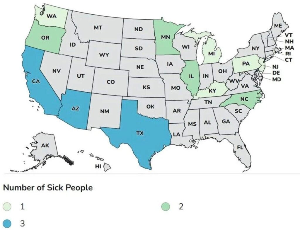 Besides the case in Kentucky, other states with cases include Arizona (3), California (3), Illinois (2), Michigan, Minnesota (2), North Carolina (2), New Jersey, Oregon (2), Pennsylvania, Rhode Island, Texas (3) and in the state of Washington.