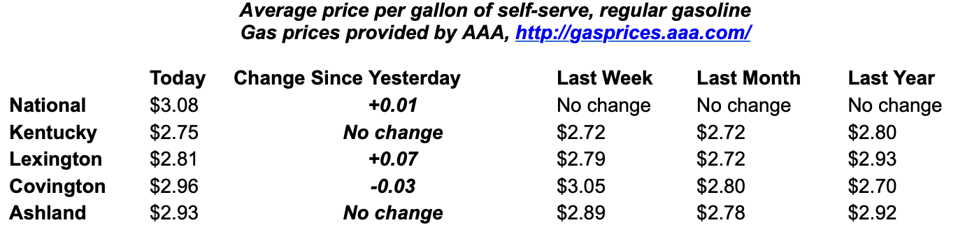 Kentucky’s average price for a gallon of regular gas edged up about 3 cents this past week, landing at $2.75. Meanwhile, the national gas price average continued to coast along at $3.08, mirroring prices one week ago one month ago and one year ago.