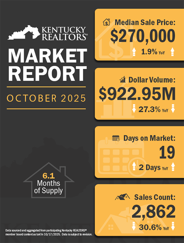 Kentucky Realtors recently released housing market data for October 2025, showing that the total volume of real estate sold for the month was $922.25 million.