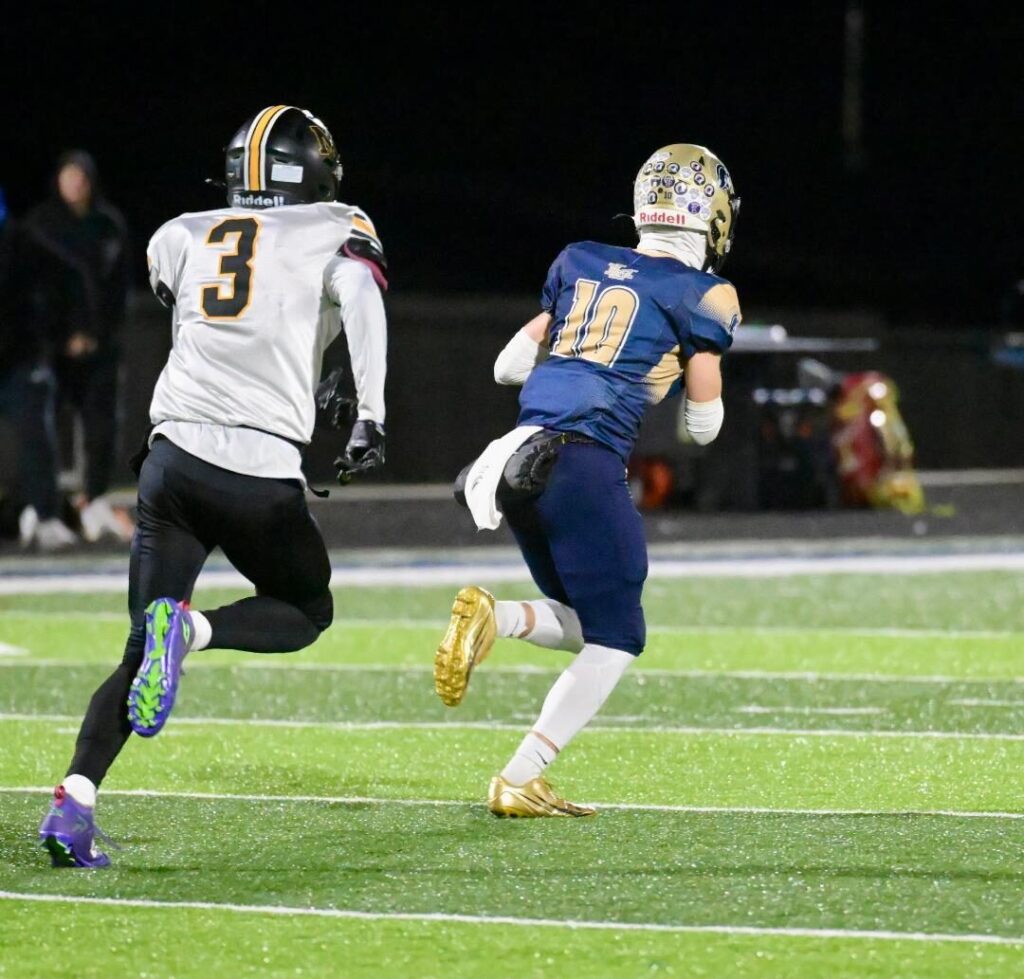 Senior quarterback and team leader Kaleb Evans, after throwing a 98-yard TD pass to speedy sophomore Colten Barger, thanked Niederman for not just making him a better quarterback during his four varsity years here, but “for showing me how to be a better man” something that will stay with him years after he’s out of high school.