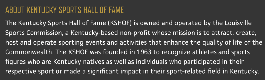 Founded in 1963, the Kentucky Sports Hall of Fame recognizes athletes and sports figures who are Kentucky natives or individuals who participated in their respective sport or made a significant impact on sports in the state. The KSHOF is owned and operated by the Louisville Sports Commission, a Louisville-based 501(c)(3) organization with a mission to create a legacy of economic and social vitality through sports.