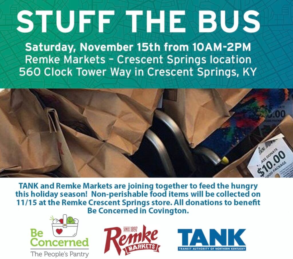 Help TANK stuff an entire bus by donating non-perishable food, personal care products and household items. All donations will benefit Be Concerned, a Covington-based nonprofit and will find their way to make needy families and children happier at Christmas.