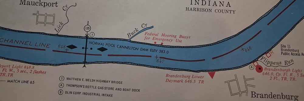 During the summer of 1965, I was a recent graduate of Eastern Kentucky University, and working aboard the Steamer DELTA QUEEN before enlisting in the U. S. Air Force later that year. Around 45 miles below Louisville’s McAlpine Lock & Dam, the QUEEN approached the worksite of a new bridge under construction spanning the Ohio River between Brandenburg and Mauckport, Indiana.