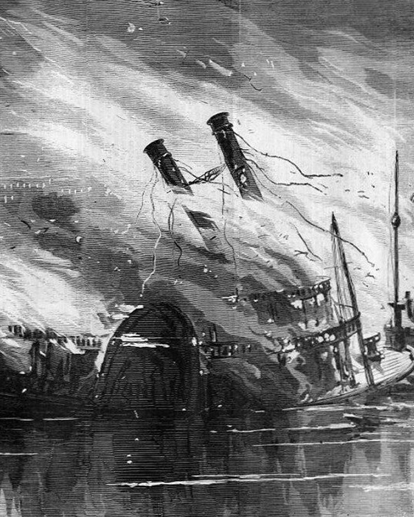 After the DEAN fulfilled her involuntary commitment, the Raiders burned her. Whatever remained of the ALICE DEAN sank beneath the waves. Over the century before I saw her brightly, white-painted wooden remains stacked high on a deck barge, local “raiders” picked over her bones whenever low river stages allowed such incursions. A year after the DEAN went down, her engines and other mechanical fittings were salvaged and used again on other steamboats.