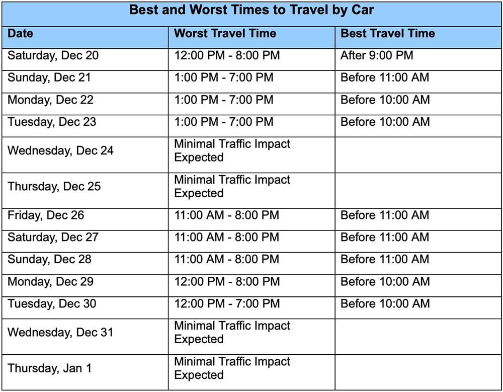 INRIX, a provider of transportation data and insights, expects Christmas week to be busier on the roads than New Year’s week, but both weeks will see days of increased traffic. Interstates will be extra congested the weekend before Christmas, as travelers hit the road on Saturday and Sunday ahead of the holiday. Friday, December 26 is also expected to be busy as travelers make moves post-Christmas Day. Because the year-end holiday travel period spans a longer time frame, travelers have more options for departures and returns. The holidays themselves — Christmas and New Year’s Day — are typically the lightest traffic-wise but crashes or severe weather could create unexpected delays in some areas.