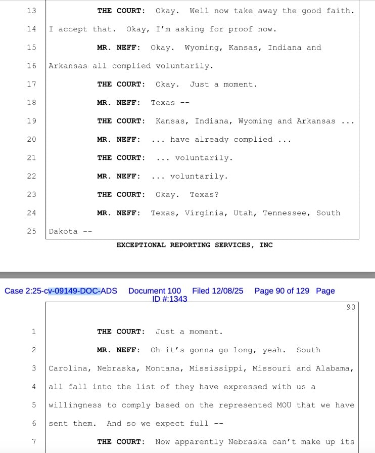 A transcript of a Dec. 4 federal court hearing showing Eric Neff, acting chief of the Justice Department’s Voting Section, listing states that he says are willing to comply with a request for voter data based on a proposed memorandum of understanding (MOU). (Screenshot by Jonathan Shorman, Stateline; click for larger image)