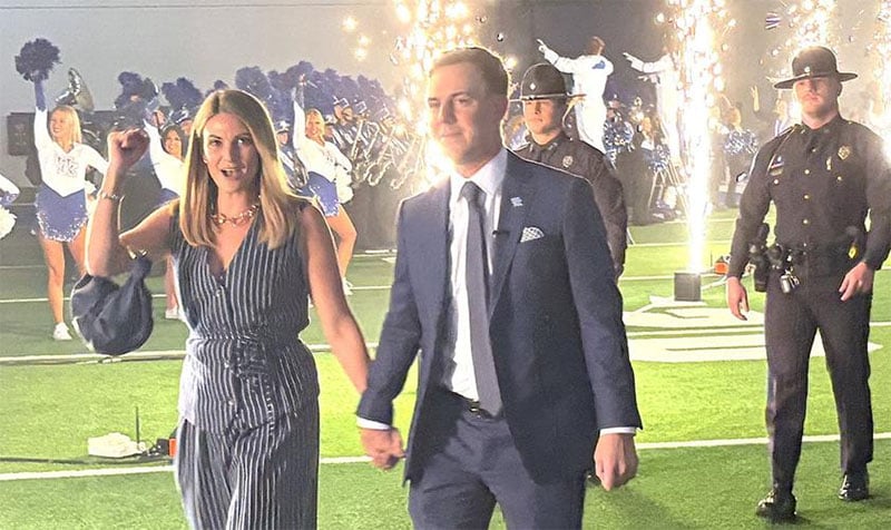 New Kentucky football coach Will Stein and his wife Darby walk to their seats during his introductory press conference on Wednesday (Photo by Keith Taylor, Kentucky Today)