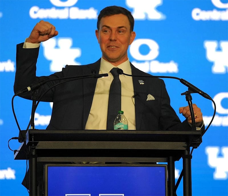 Will Stein was pumped up during the introduction press conference as Kentucky’s new head football coach. (Photo by Keith Taylor, Kentucky Today)