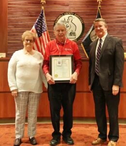 Judge/Executive Steve Pendery and Commissioners Brian Painter, Tom Lampe, and Geoff Besecker presented Carl Biery with the Campbell County Citation of Achievement for his recent accomplishment as the grand prize winner of the National First Responder of the Year award, presented by the National Association of Convenience Stores Foundation.