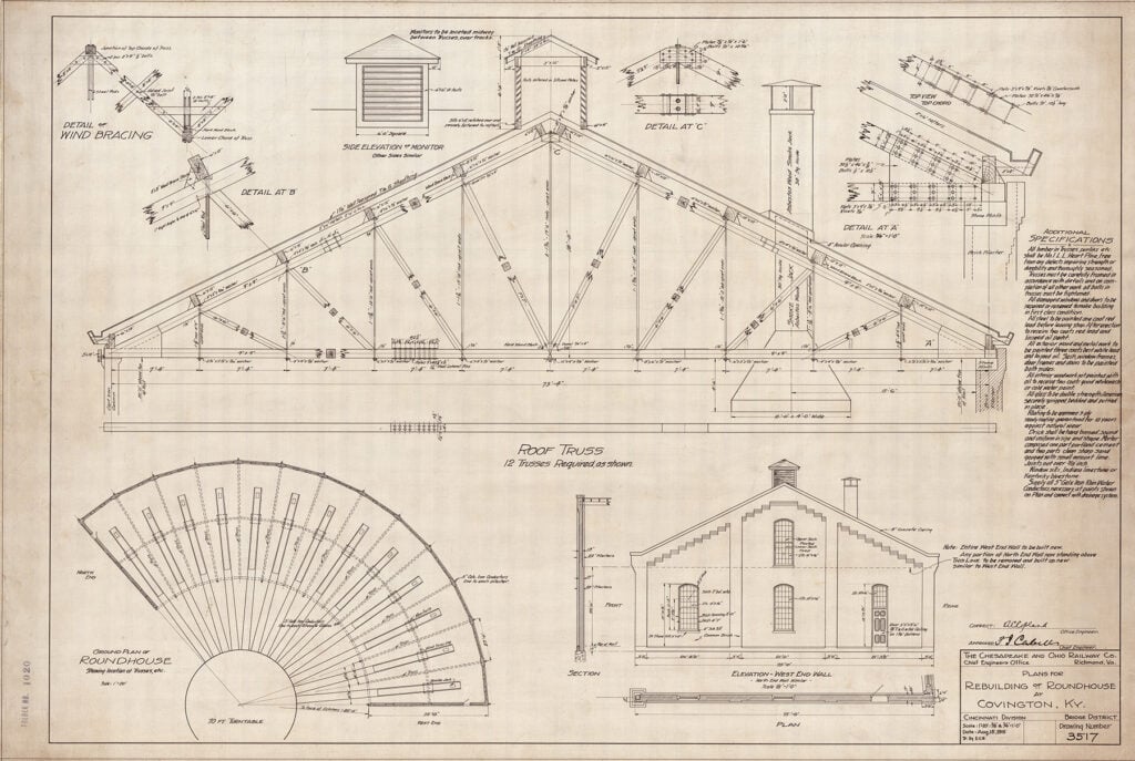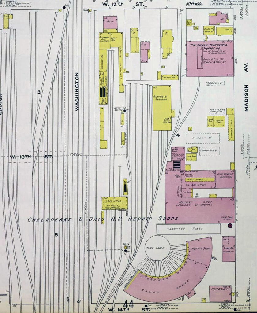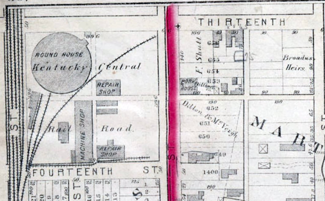 There aren’t many surviving histories of Covington’s railroad facilities. The earliest depiction of repair shops and a roundhouse is a Covington atlas published in 1877. It shows a roundhouse at the corner of 13th and Washington streets, a machine shop and two repair shops.
