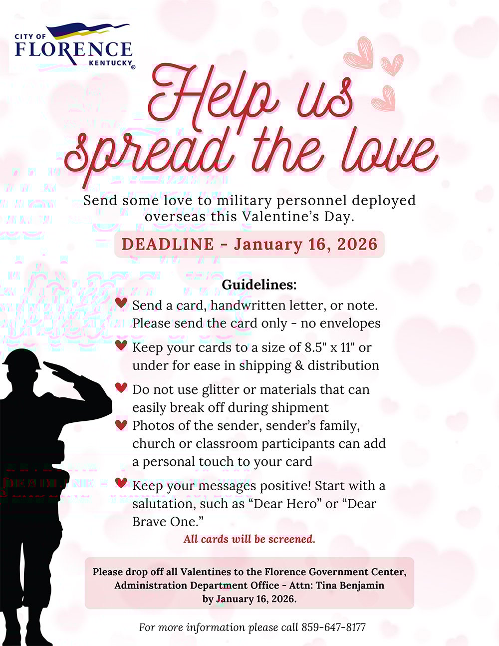 The City of Florence is inviting residents of all ages to send heartfelt messages of appreciation to U.S. military personnel deployed overseas through its Valentines for Troops program ahead of Valentine’s Day.