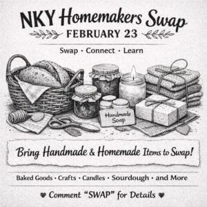 The Homemaker Swap will take place Sunday, Feb. 23, from 10 a.m. to noon at the Kenton County Public Library’s Erlanger Branch, located in the Bronte Room. For more details or to participate, please visit the Facebook group page NKY Homemaker Swap.