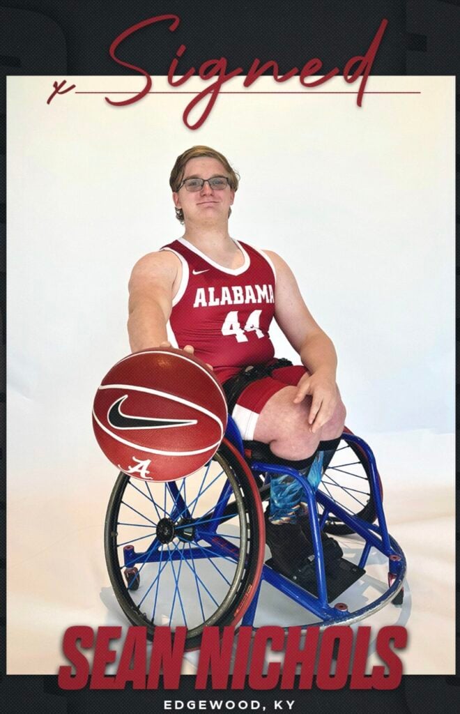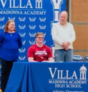 He signed a Letter-of-Intent Friday night between the Villa Madonna Jayvee and Varsity basketball games – with the University of Alabama to play wheelchair basketball. He will be receiving scholarships to cover costs.