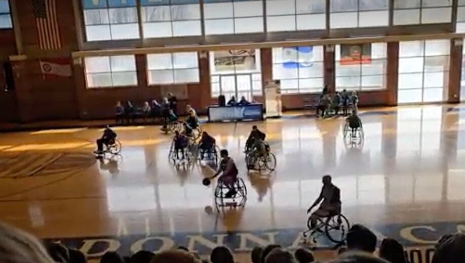 The differences between the non-wheelchair game are, “How you dribble,” he said, “and there is a no carry the ball rule. You can dribble once every two pushes; and even carry the ball in your lap.”
