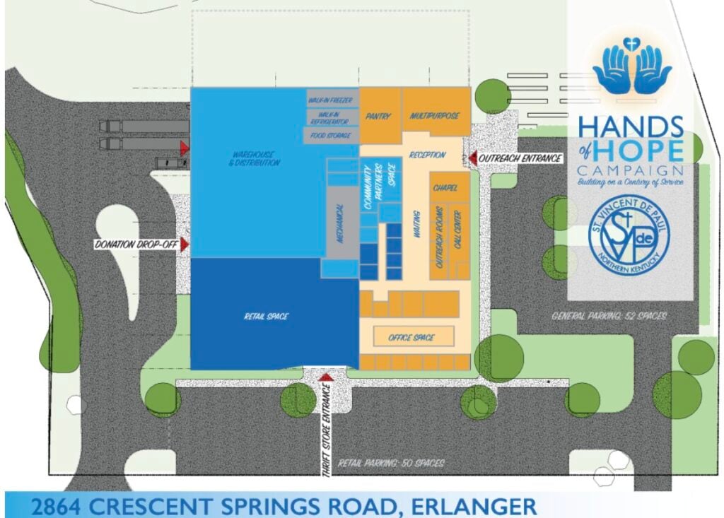 The goal of the capital campaign is to fund a new headquarters. The current headquarters on Crescent Springs Road has been in use since 1969. SVdP NKY’s new 40,000+ square-foot facility in Erlanger will more than double the current space.