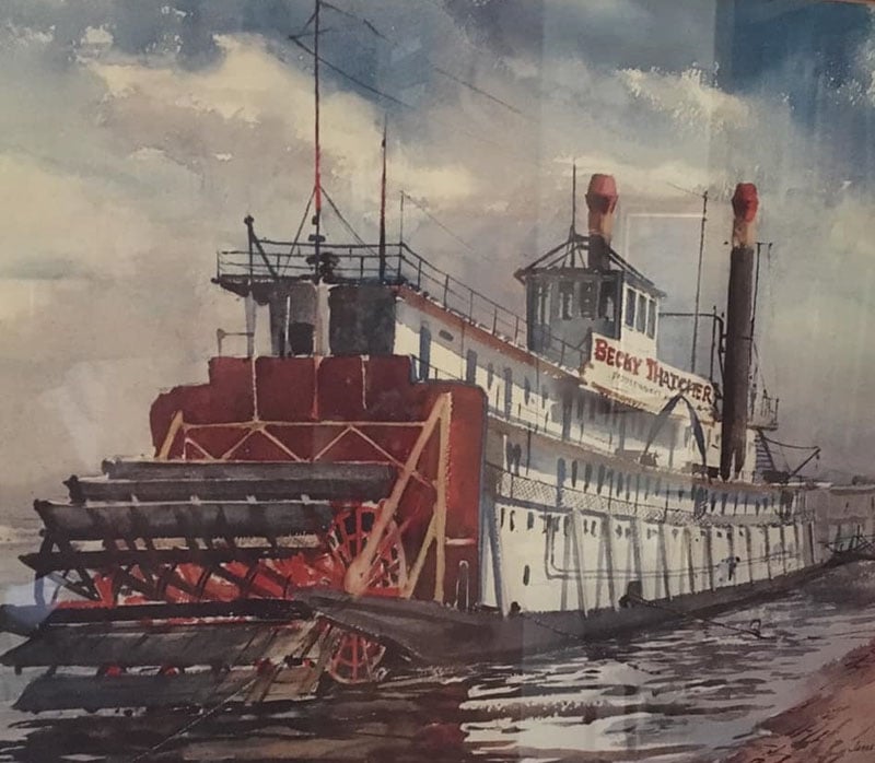 Most of my acquisitions these days are limited to small, relatively inexpensive river-related stuff. I’ve become an easy mark for steamboat-themed coffee mugs, pencil sketches by Upper Mississippi River artist Matthew Cooper, or an interesting geehaw, such as a small wooden DELTA QUEEN Christmas tree ornament I recently found on eBay.
