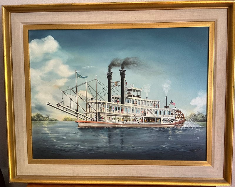The recently-acquired 1971 oil painting of the JULIA BELLE SWAIN (JBS) is a treasure that I never tire of admiring hanging above my computer station. Once the personal property of Mrs. Judy Shelton, the namesake of two steamboats named JBS, the painting came my way via her grandson, who found my name in my TRIBUNE writings and asked if I could find a caretaker who would appreciate his beloved grandmother’s treasure. It didn’t take long to find someone. ME!