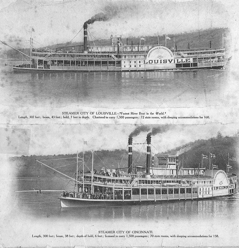 The sidewheelers CITY OF LOUISVILLE (COL) and CITY OF CINCINNATI (COC), both “brag boats” belonging to the Louisville & Cincinnati Packet Line, exclusively served the Louisville and Cincinnati market. The COL, built by Howard Shipyard in 1894, at 301 x 42.7 x 7-feet with Frisbie-built steam engines with 30” diameters and 10-foot piston strokes, had one or two more boilers than her companion.