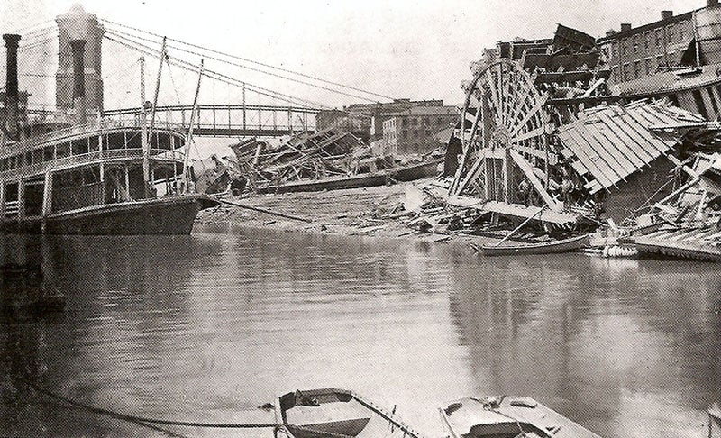 ”The flood was particularly difficult for Greater Cincinnati, where the river stayed above flood stage (52 feet) from January 18 until February 5 and reached its crest of 79.99 feet on Tuesday, January 26. Communities along the Ohio River in Kentucky, Indiana, and Illinois also faced severe problems. As the flood waters rose, gas tanks exploded, and oil fires erupted on the river. Parts of Cincinnati remained under water for nineteen days, and electricity and fresh water were in short supply. On January 24, after an accident dumped one million gallons of gasoline into the Ohio River from ruptured storage tanks, the water caught on fire in Camp Washington. On the very same day, the city’s water supply ran dry. That day was so terrible, Cincinnatians still remember it as Black Sunday.”