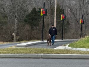 There are islands along the trail to separate the walking trail from the one way lane that allows cars to leave Cherry Hill. The ten islands, each about two feet wide, will have flower pots, and there will be banners on either side of the bridge.