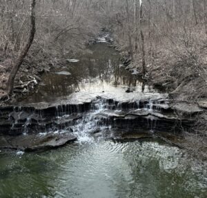 The spine is the trail across the street from the dog park, and there is a well marked crosswalk for people to get from one side of the street to the other. The trail is paved all the way to where it meets Turfway Road, but the trail is not completely finished, although the scenery along the trail is beautiful and stunningly picturesque in places, such as off the bridge, where water flows over rocks. From the beginning of the trail to Turfway is a little under a mile.