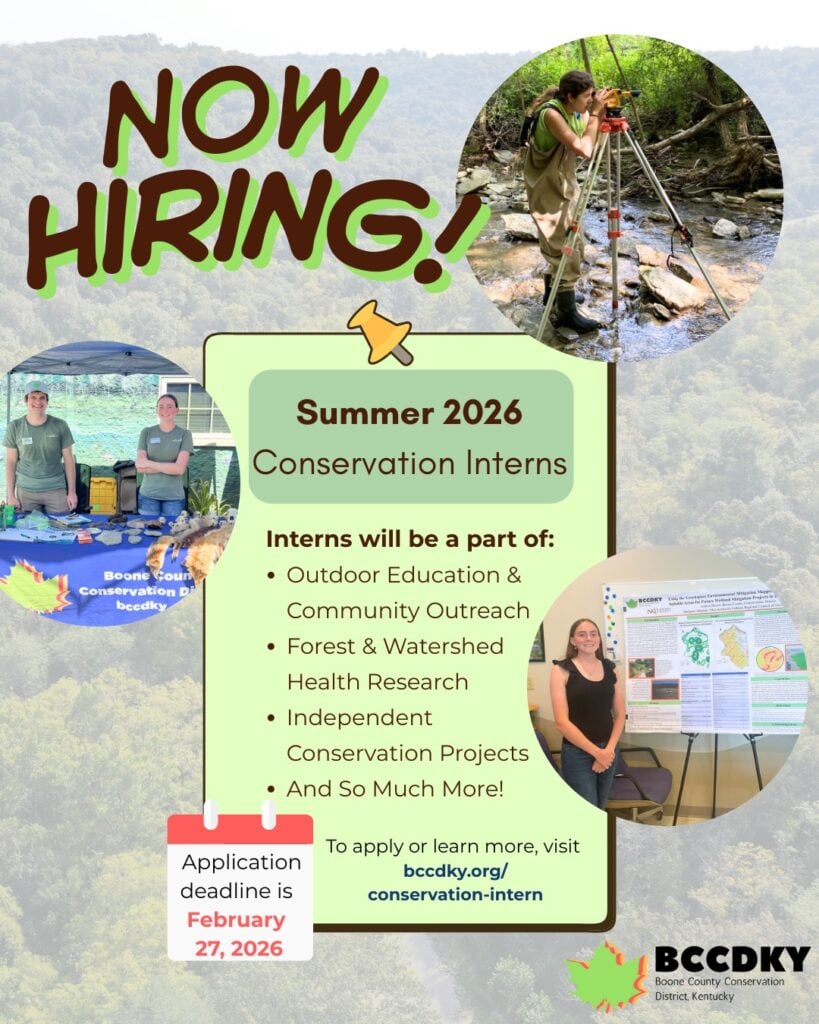 The Boone County Conservation District is seeking two interns for the summer 2026 season. Interns will assist with a variety of hands-on projects, including habitat management, data collection, and environmental education programs.