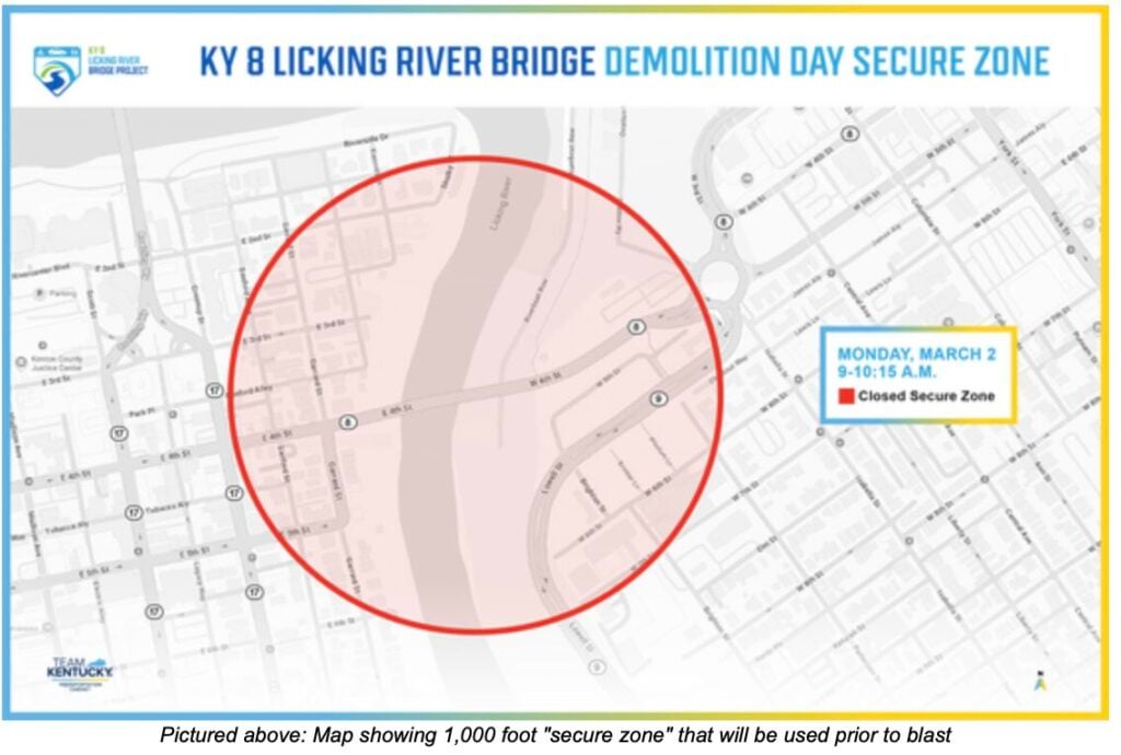 A controlled blast to demolish the existing KY 8 Licking River Bridge is scheduled Monday, March 2, and authorities have worked to safely secure areas around the zone to protect the public.