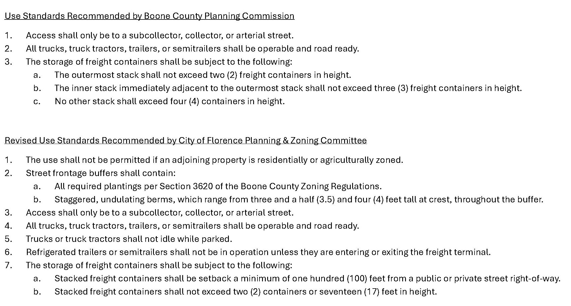 The Boone County Planning Commission recommended approving seven use standards, including minimum distances from agricultural and residential districts, screening, maximum heights for stacked containers and prohibitions on idling while parked.