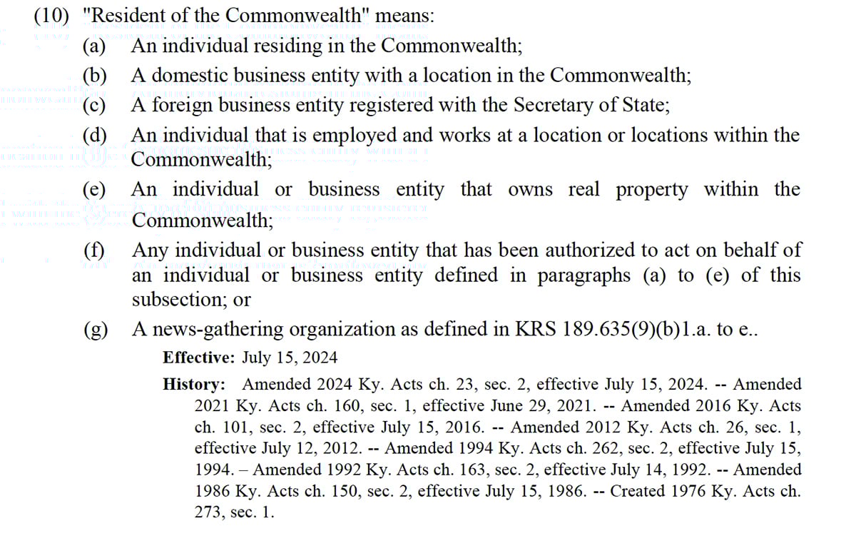 The law has eight categories in its definition of “Resident of the Commonwealth.” Among them are individuals living in Kentucky, businesses incorporated in Kentucky, individuals and businesses owning property in Kentucky and individuals “employed and [working] at a location or locations within the Commonwealth.”