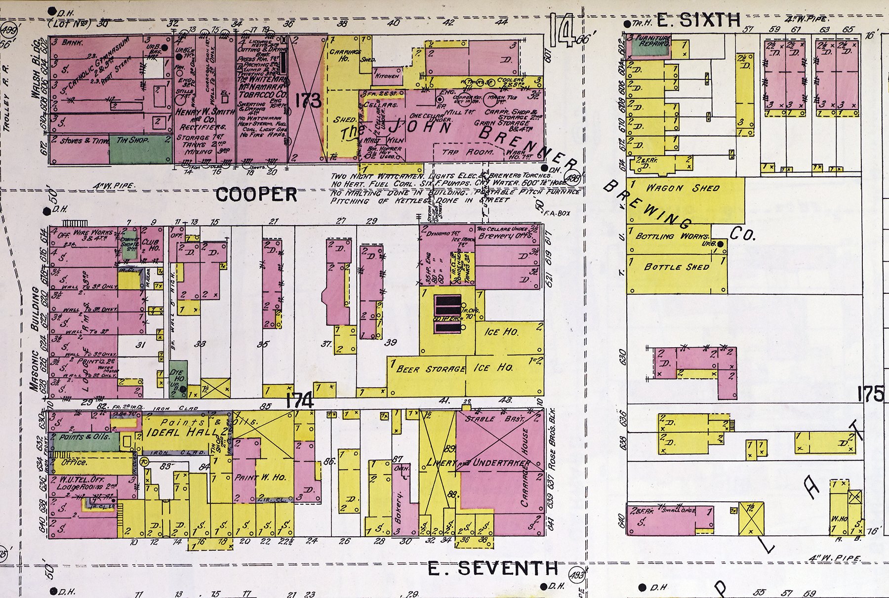 Fire insurance map published in 1894 that shows the Brenner brewery complex and tunnel beneath Pike Street. (Library of Congress image)