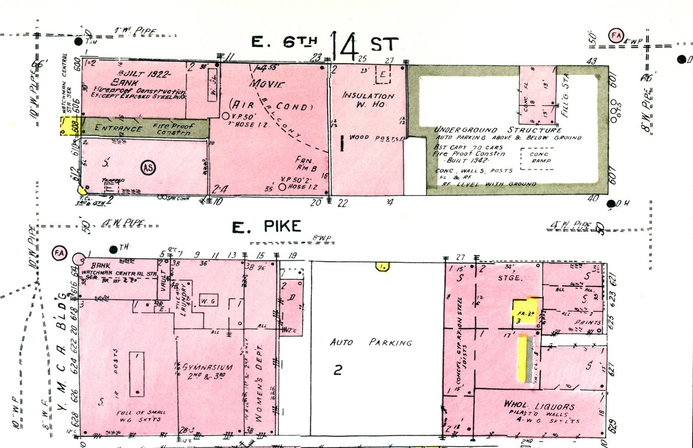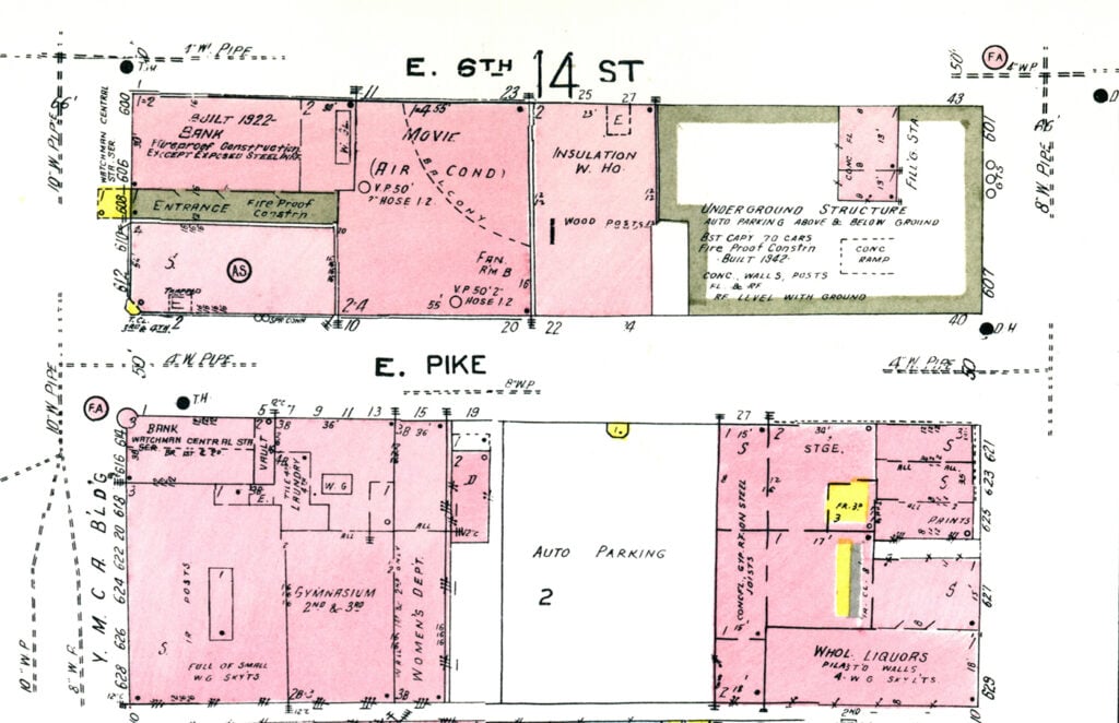 Fire insurance map published in 1954 that shows the underground parking garage and concrete block service station building in the top right. (Library of Congress image)