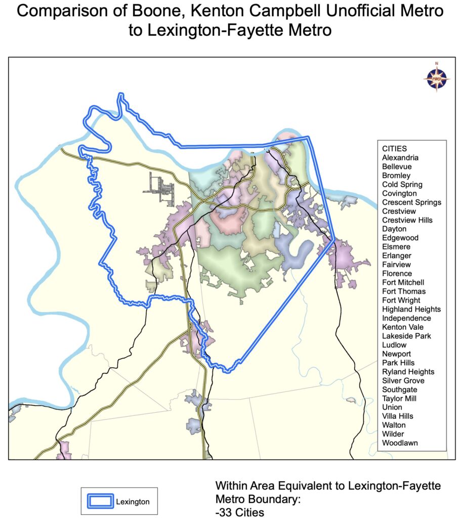 A simple comparison makes the point clear. When you overlay Lexington/Fayette County onto Boone, Kenton and Campbell, nearly all our cities fall within the same footprint.
