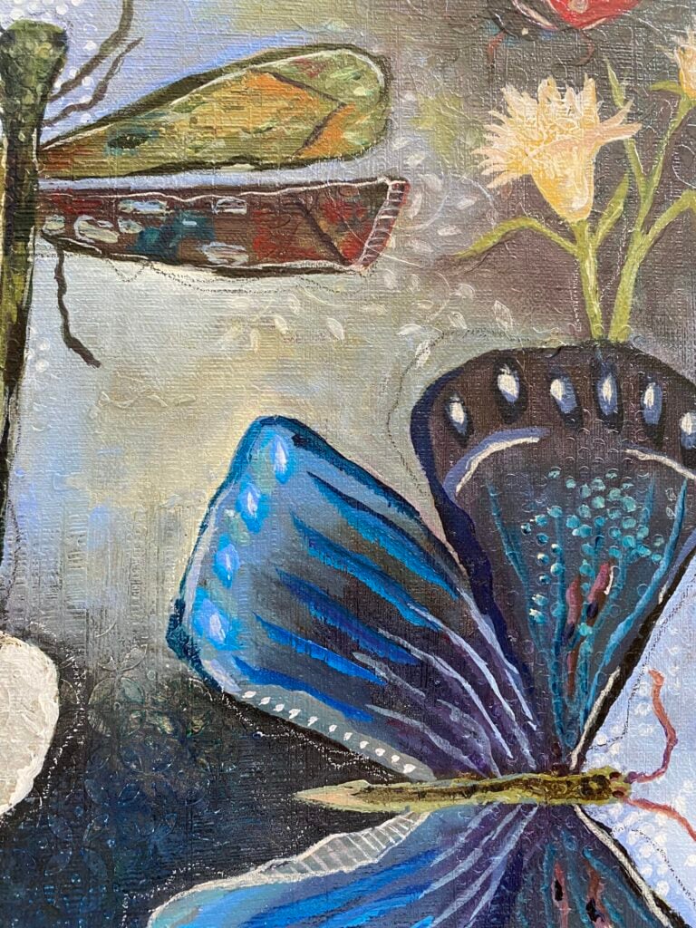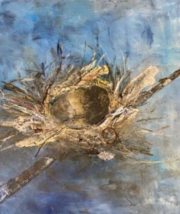 “I am very much a mixed media artist, so I use a lot of paints and plasters, but then I incorporate things like vintage papers, fibers, and hand stitching, and I emboss patterns into my pieces,” she explained. “So they have definite texture and depth to them. And they’re more representative, not realistic.”